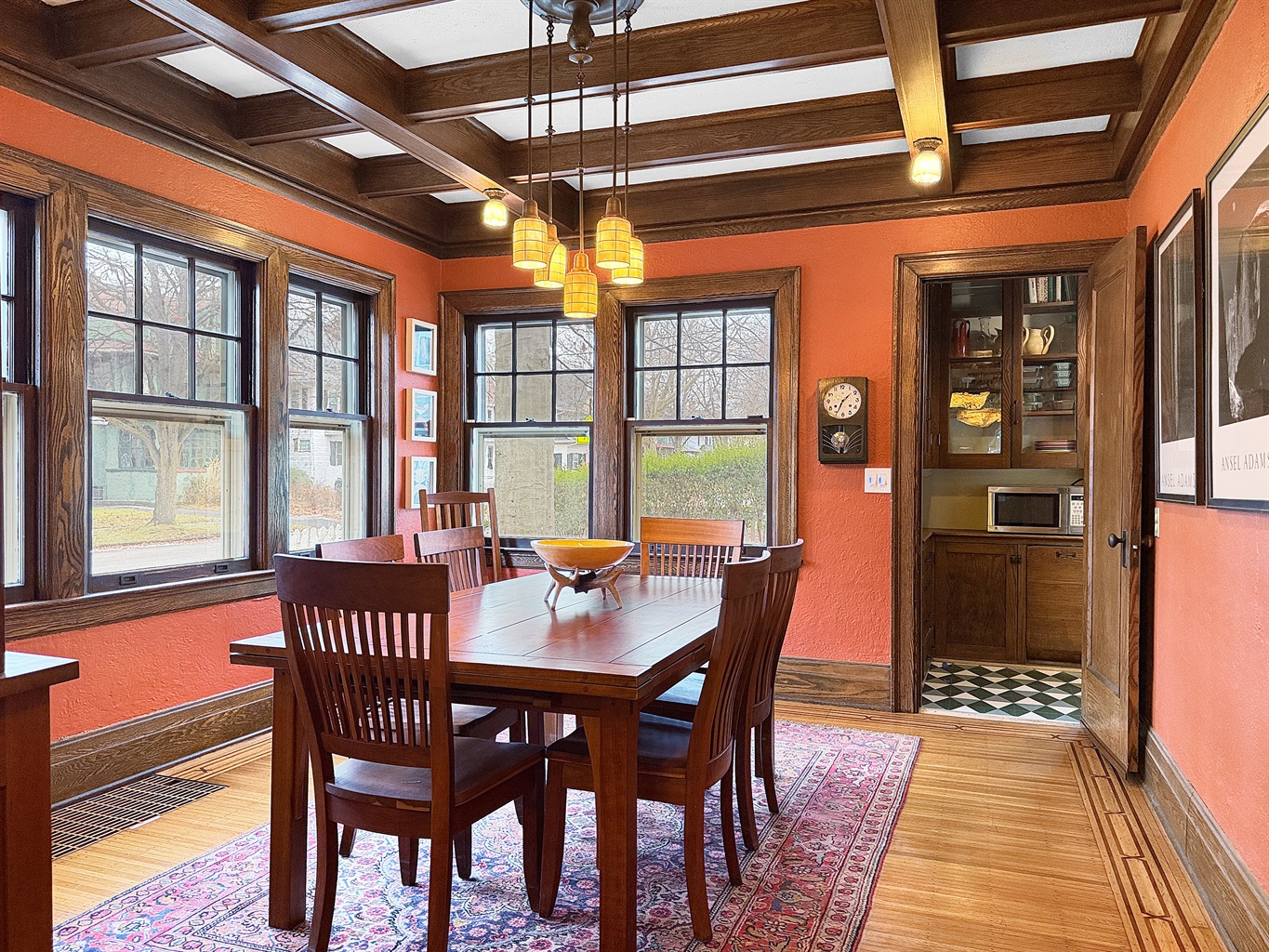 The formal dining room is a showpiece, featuring rich wood-beamed ceilings, Stickley furniture, banks of windows, and original Arts & Crafts light fixtures. The refurbished kitchen is fully equipped with modern appliances and a small table for quick breakfasts or to read the morning news. The kitchen connects to a butler’s pantry and mudroom—practical for everyday living.
