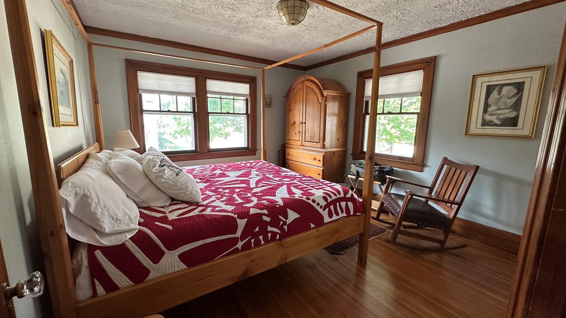 Up the hand-carved staircase, light filters through leaded-glass windows onto a spacious landing. The luxurious primary suite—initially two separate bedrooms—includes a king-size Tempur-Pedic bed, a private sitting area with a 55" television, a walk-in closet, and a serene outdoor Juliette porch. A second bedroom, affectionately known as the Bird Room, features a charming four-poster king bed with another Tempur-Pedic mattress. A third bedroom features a lovely Queen-sized bed, a vanity mirror, and a window seat. A full bathroom with a shower-over-tub completes this level.